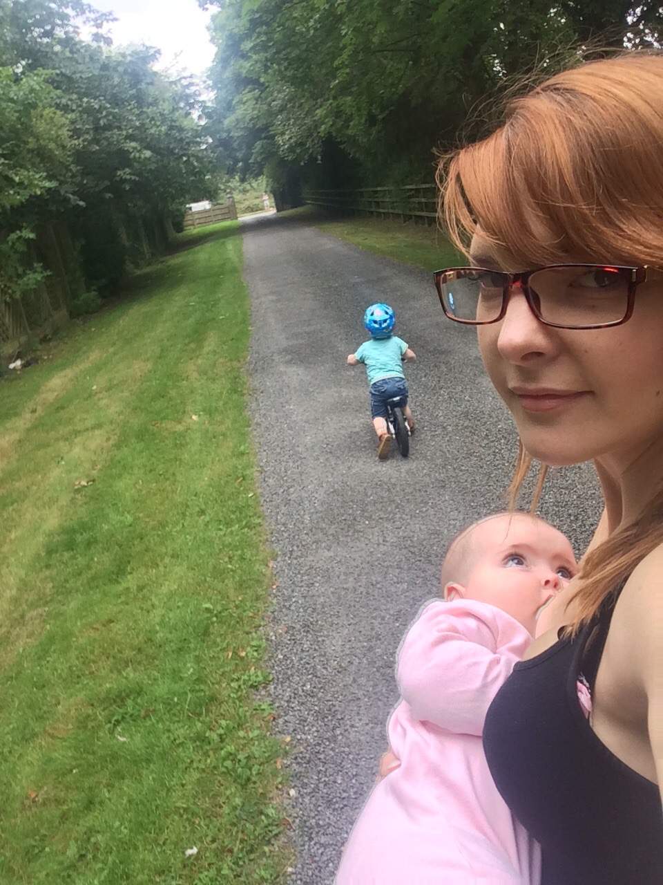Back in the bedroom I pick out some clothes and dress hastily before baby realises boob has been temporarily replaced with a dummy. I pick up (The now wailing!) baby and make for the stairs. Toddler runs after me with cries of “carry you carry you” I kneel down and scoot him in to my spare arm and carry both kids downstairs. Toddler heads straight for his toy box and I plop baby in her sit me up ring before sprinting back upstairs to empty the overflowing washing basket and retrieve my coffee cup.