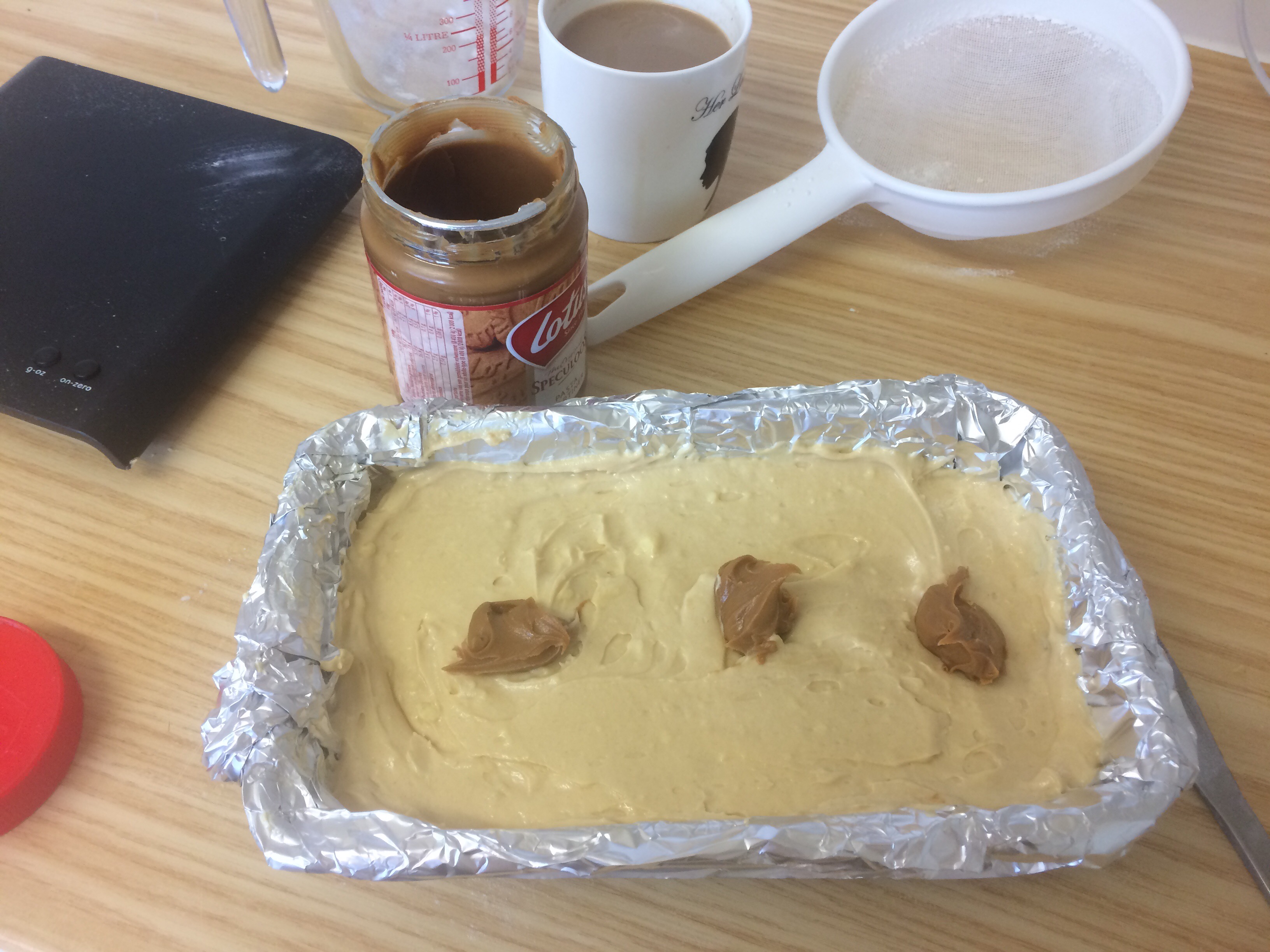 After creaming the butter, Spéculos and Sugar I’ve added the 4 eggs (beaten) then folded in the flour with 2 tsp of baking powder before transferring in to a tin and adding 3 dollops of Spéculos on top.